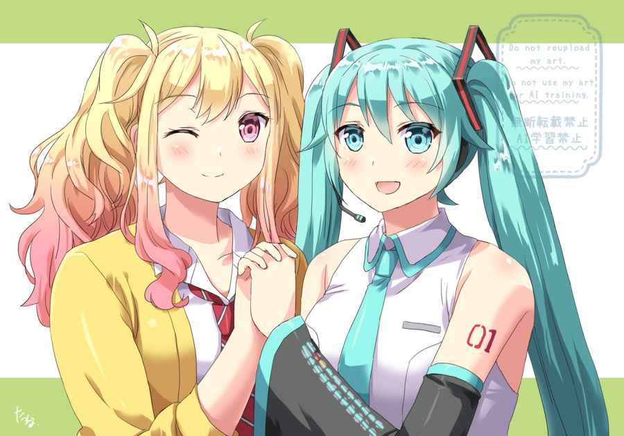 今日はいいツインテールの日だそうなので、昔描いたミクさんと咲希ちゃん自分得ツーショ絵を再掲してみます。